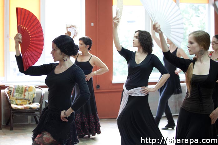 Интересно заниматься кистями. Вращение кистей и характерная пластика рук передают индивидуальную манеру каждого танцора в его ощущении музыки и пульсации фламенко и создают неповторимое пространство и атмосферу танца. Я слышала о сравнении движения кисти и изящной игры с веером, их называют флорео.